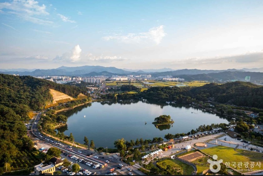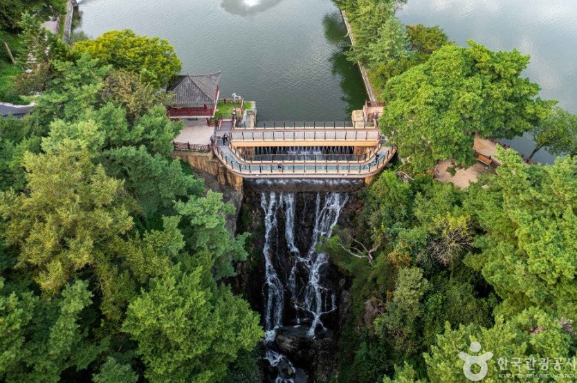 - 특징: 신라 진흥왕 때 축조된 인공 저수지, 벚꽃과 산책로. 용추폭포 유리다리가 포인트. 포토 스팟으로 유리다리와 미디어파사드 추천.