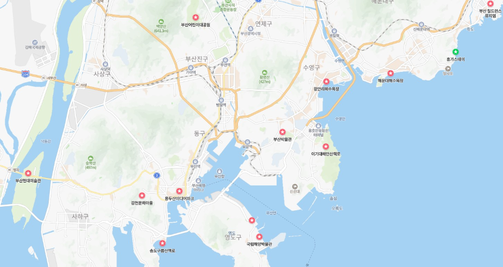 - 특징: 광안대교 야경이 유명한 해변. 산책로가 잘 조성됐다.